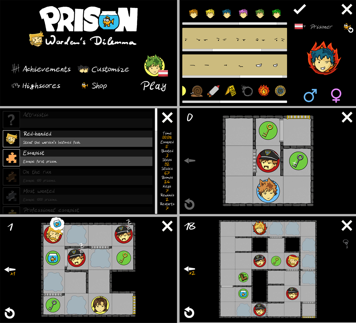 A grid-based puzzle game where a prisoner has to escape from the warden and his guards. It features online leaderboards, character customization, and achievements.
